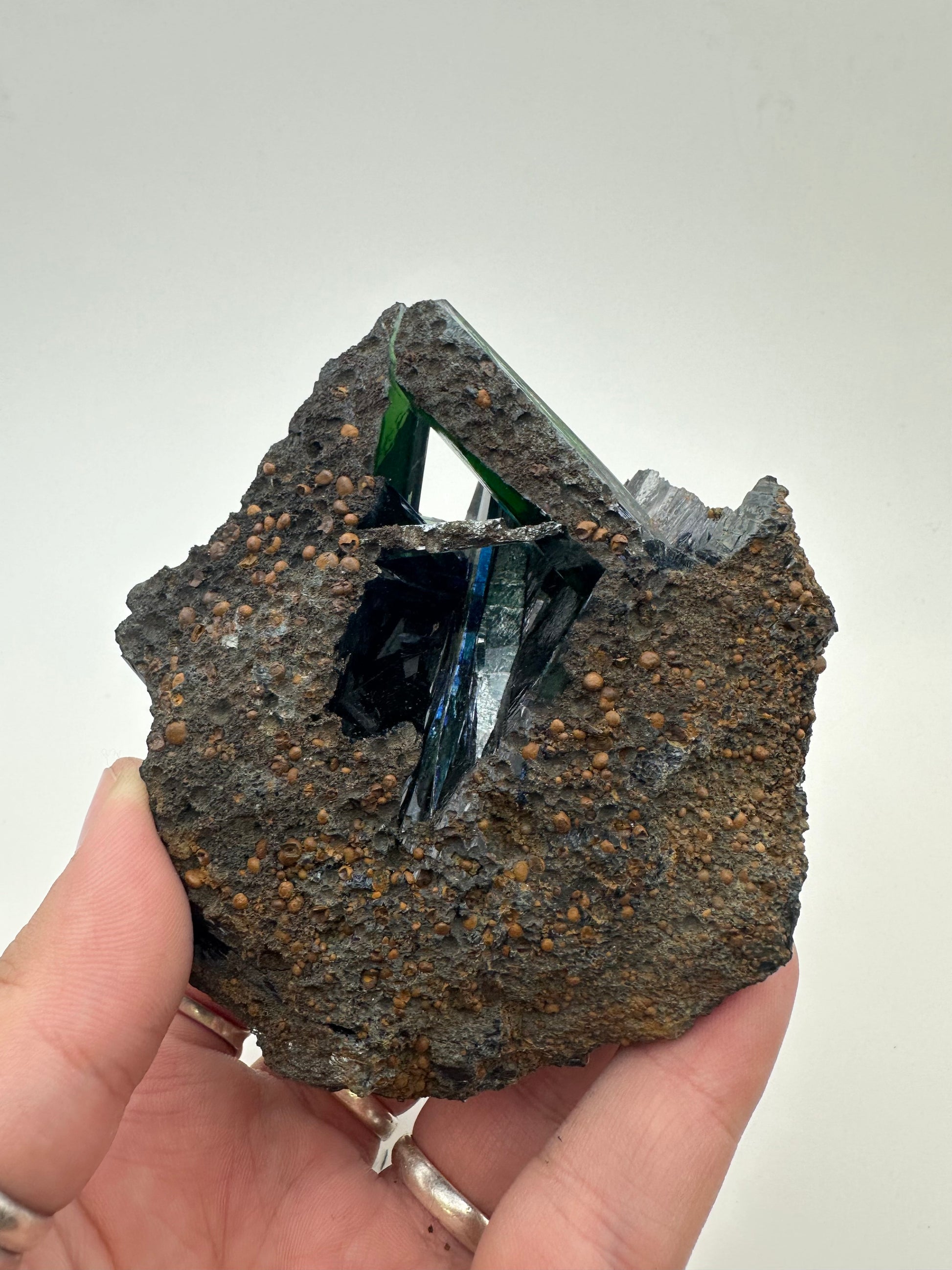 This unique specimen is approximately 9.5cm by 8.5cm at its widest and longest points and has both blue and green crystals visible depending on the lighting and angle.