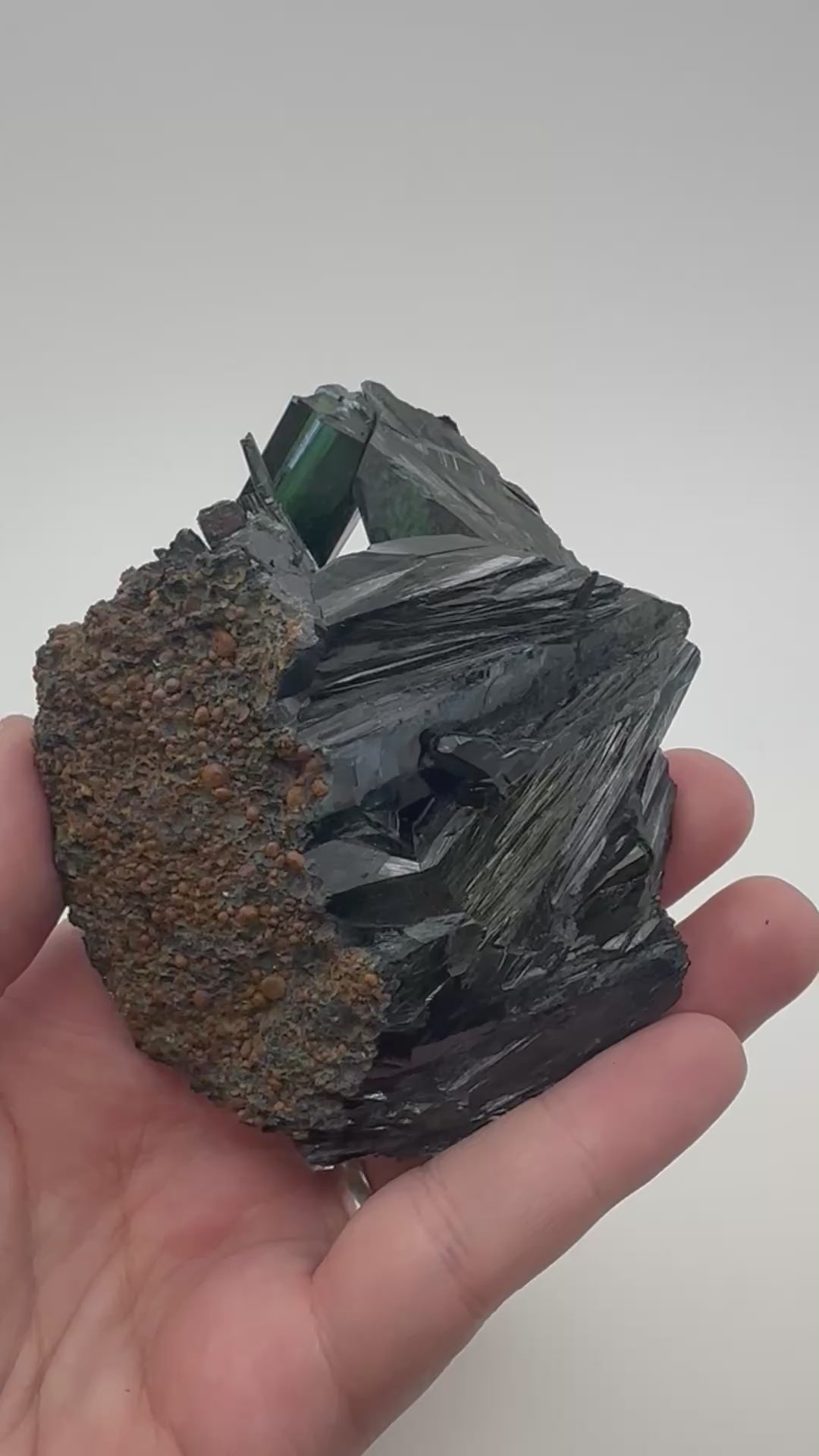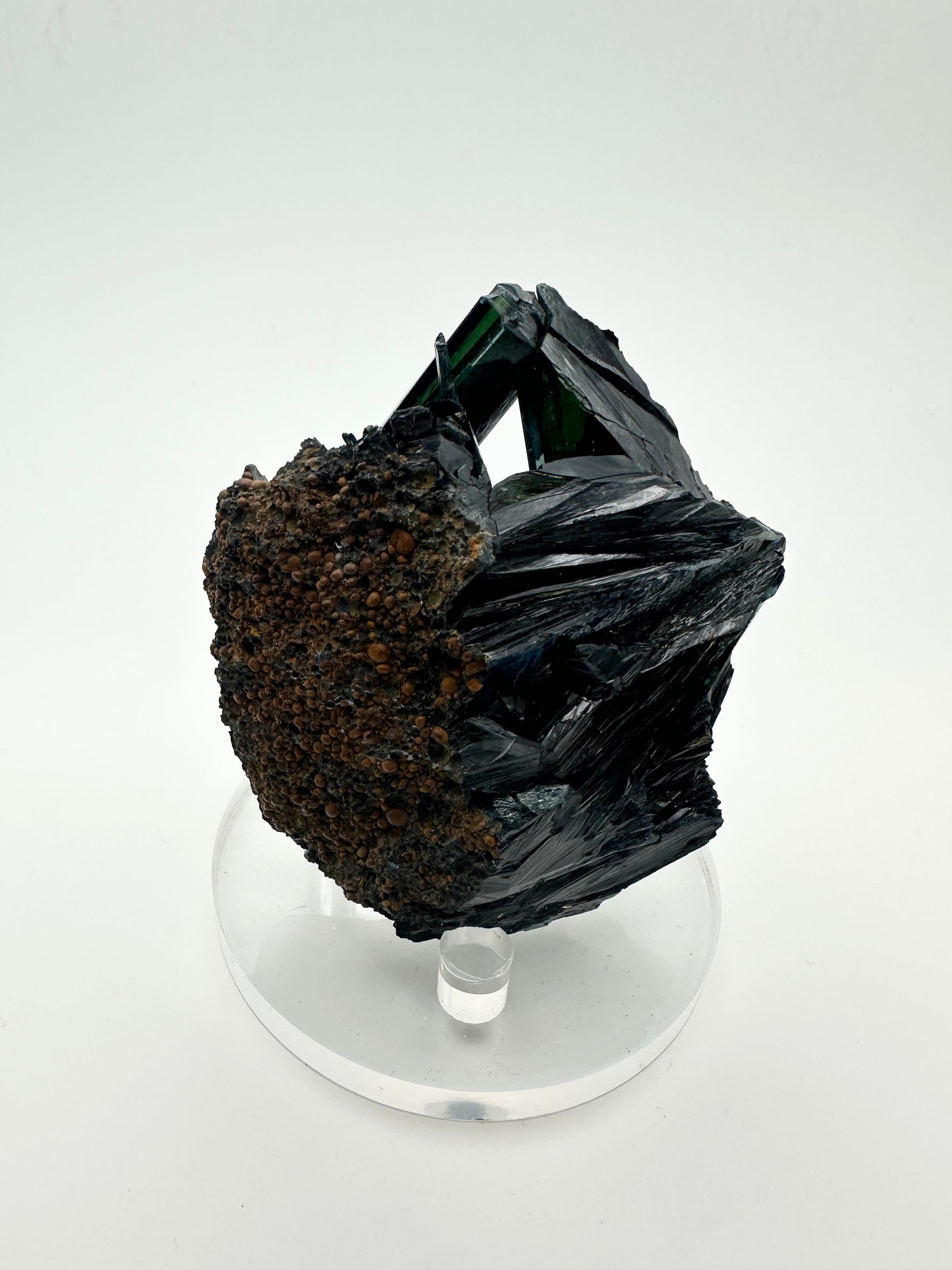 Vivianite is a striking phosphate mineral known for its deep blue-green hues that intensify when exposed to light. Found in sedimentary environments, peat bogs, and alongside fossils, it often forms delicate transparent crystals.
