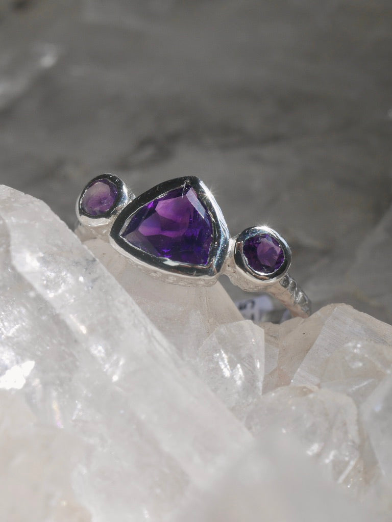 This sterling silver Amethyst ring features a bezel-set triangle Amethyst at its centre, flanked by two round bezel-set stones.