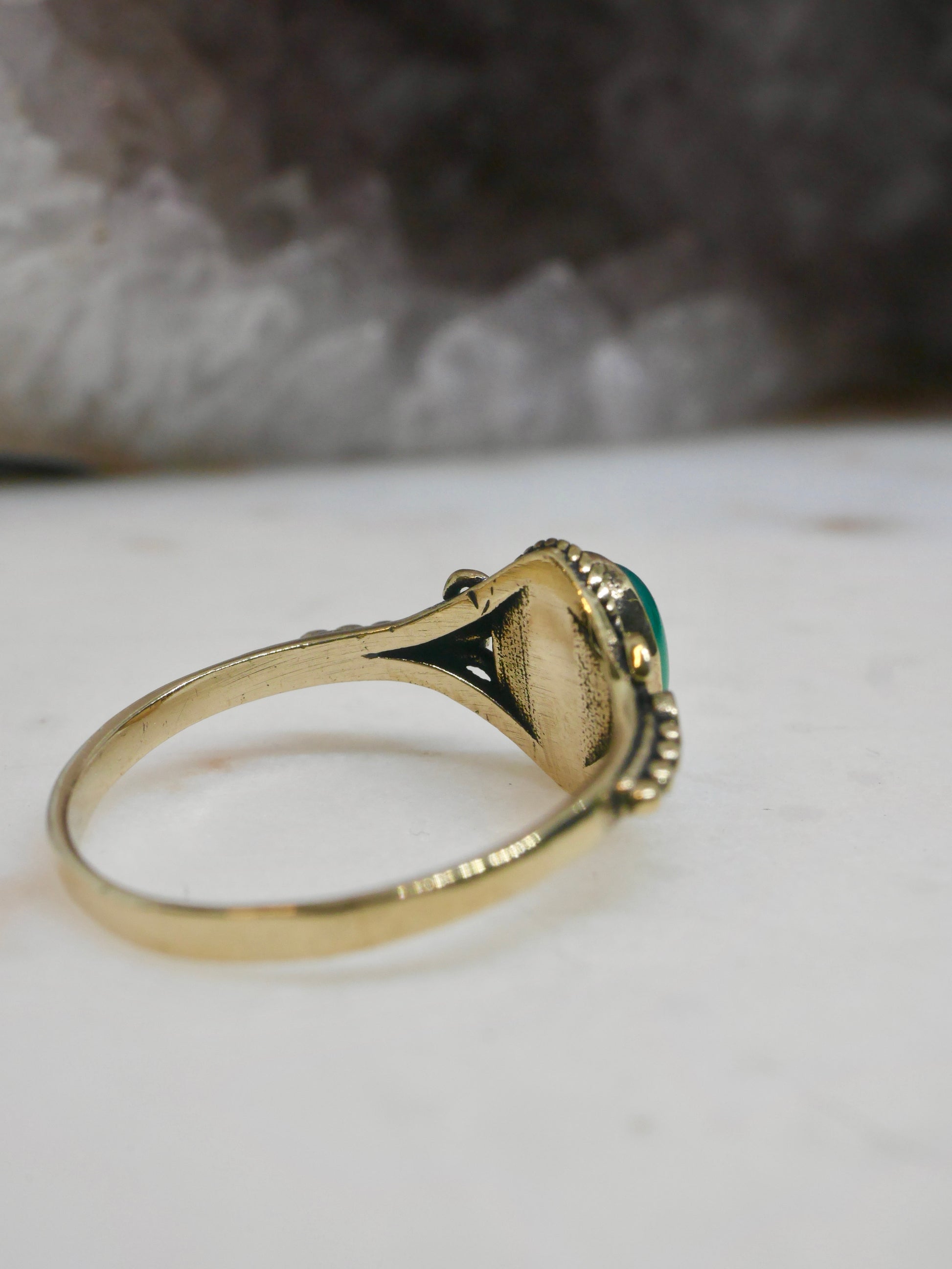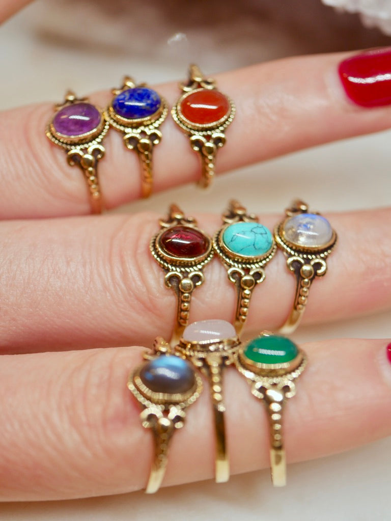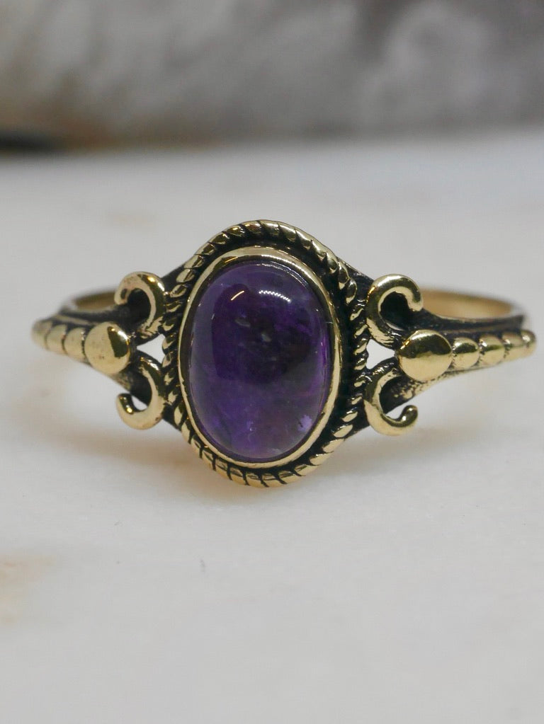 A soothing oval amethyst sits neatly in polished brass. It's the perfect everyday ring.