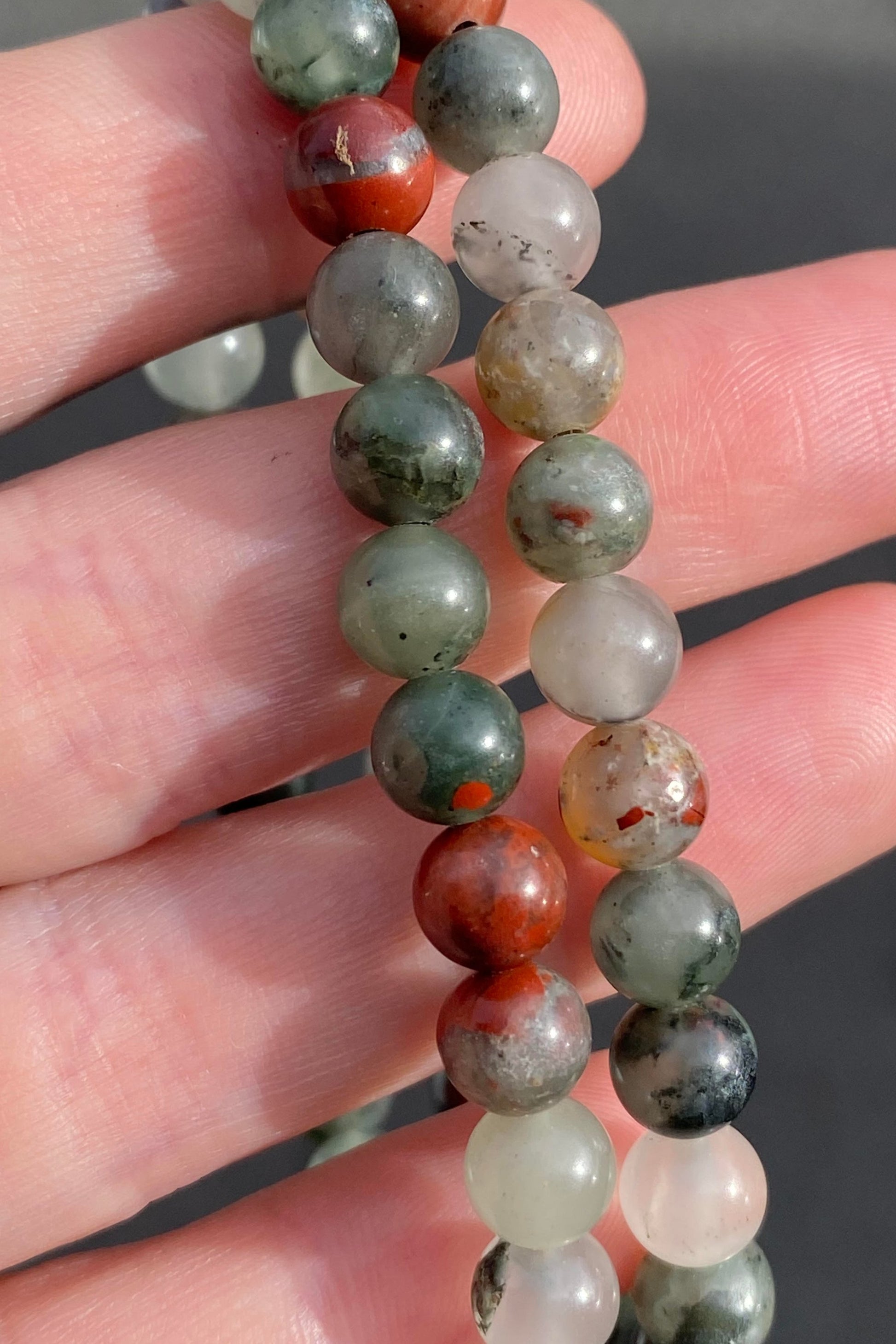 Bloodstone: Healing, intuition, creativity, vitality, courage, strength, grounding, root chakra, purifies auric field.
