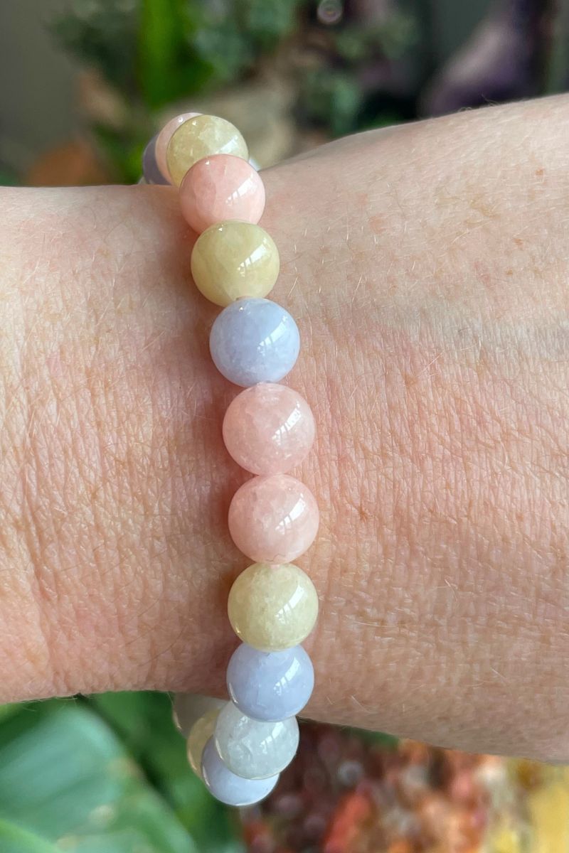 The bracelet displays a blend of soft pink from morganite and serene blue from aquamarine, creating a "cotton candy" effect. Also features heliodor.