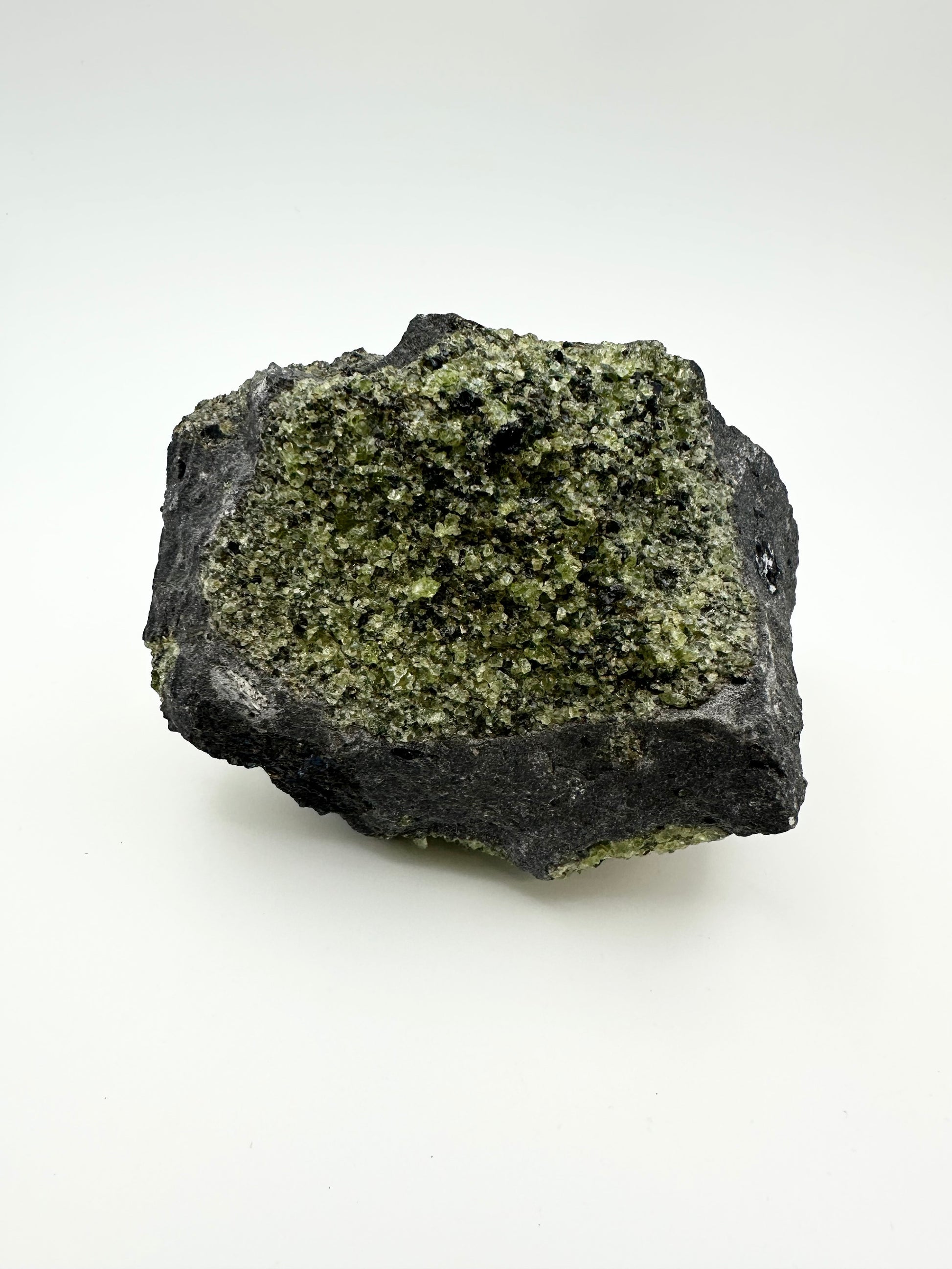 This specimen is naturally occurring olivine crystals embedded within basalt rock.