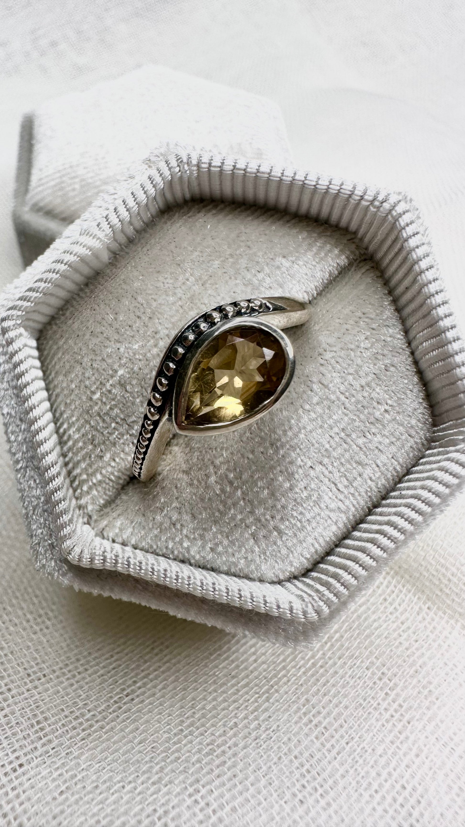 Radiate warmth and positivity with this natural Citrine ring, crafted in solid sterling silver. Featuring a faceted pear-shaped Citrine measuring approximately 6 x 10mm, this ring captures the golden glow of the sun, making it a perfect piece for everyday wear or special occasions.