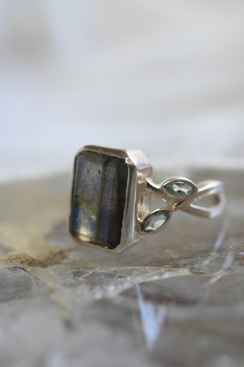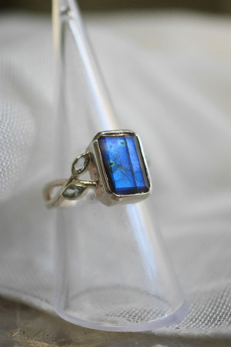 This sterling silver ring features a beautiful labradorite stone, with aquamarine leaf detailing.