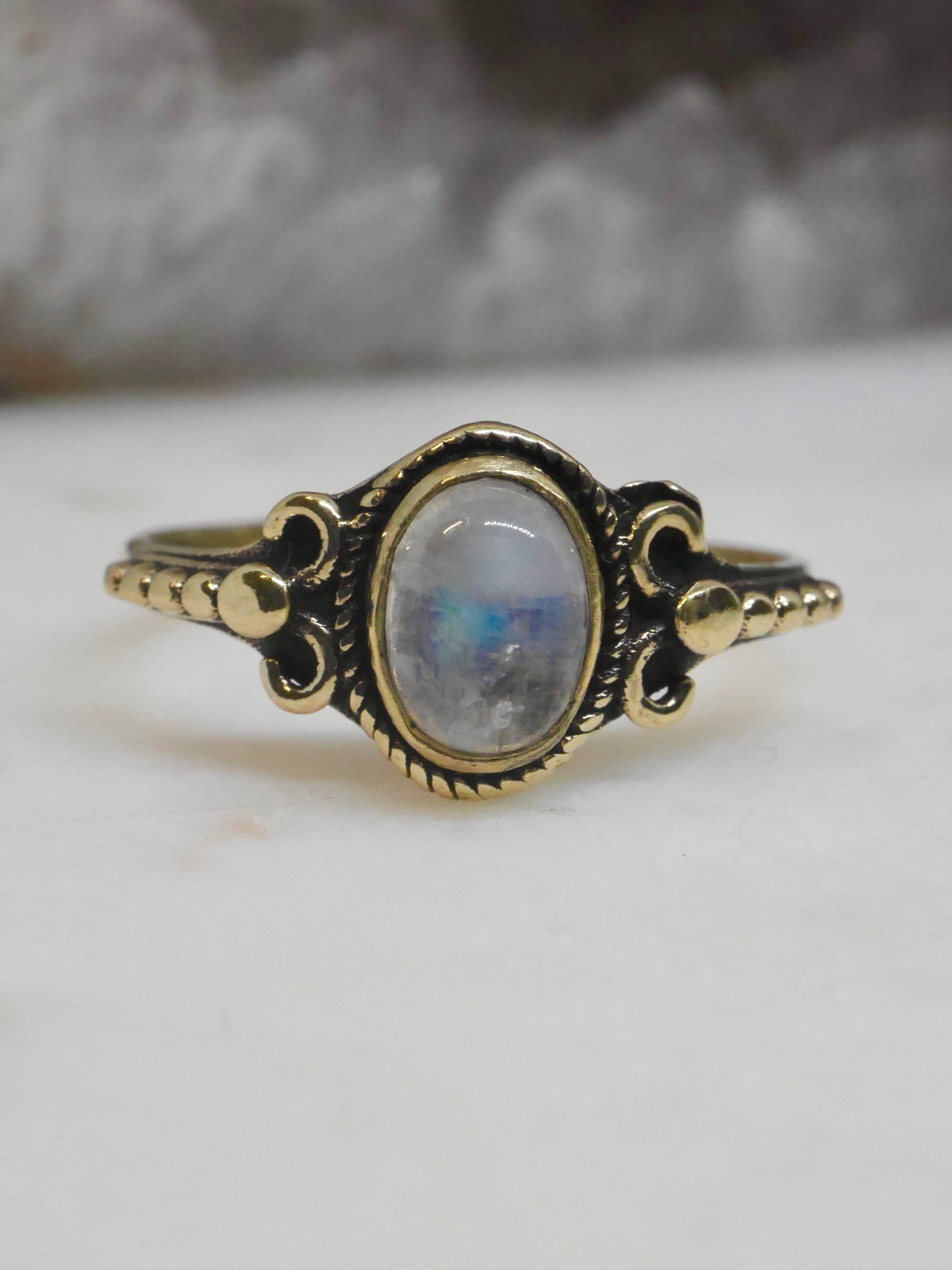 Softly glowing moonstone rests at the heart of this brass ring, offering a calm, luminous energy.