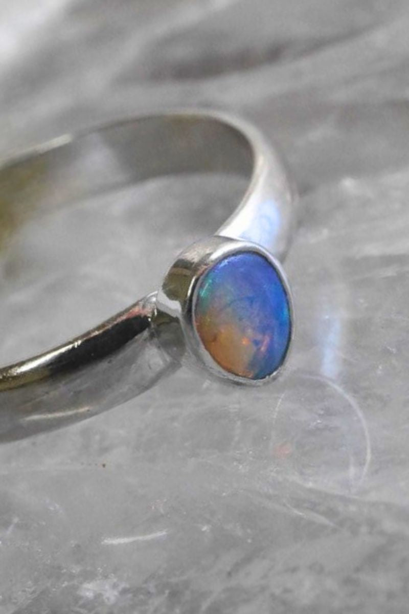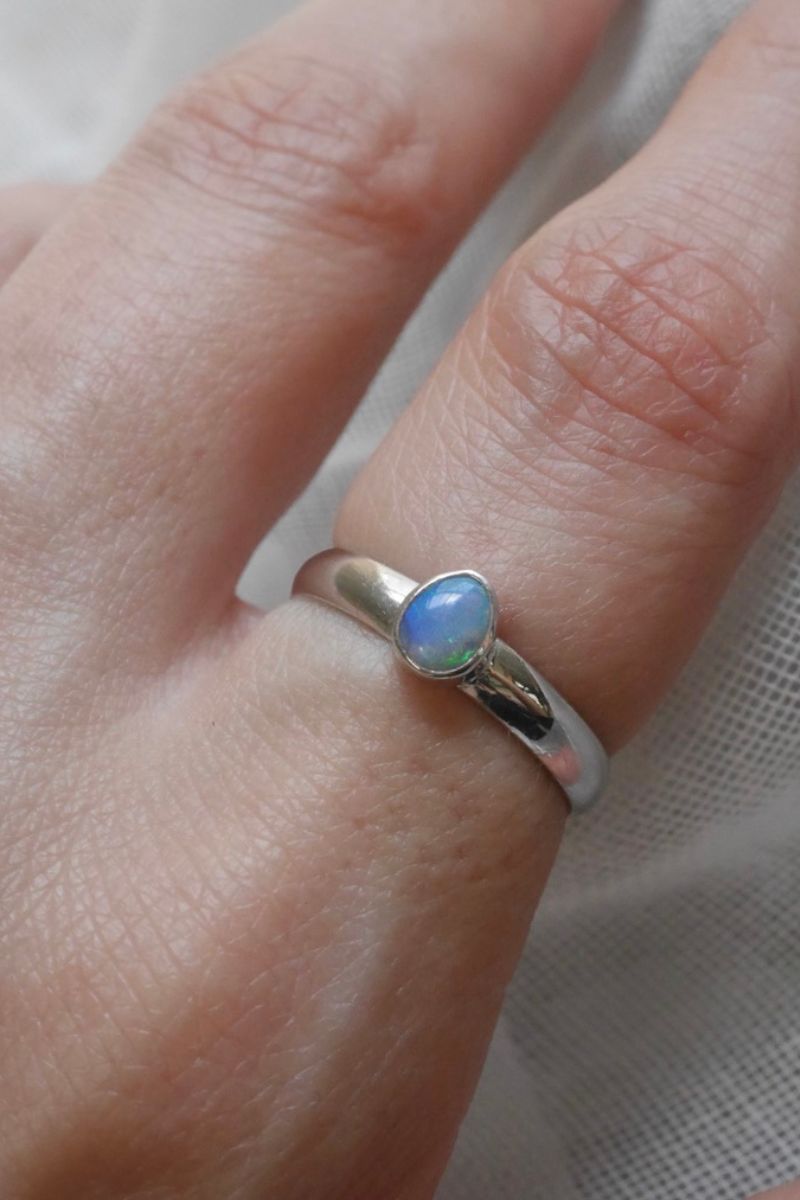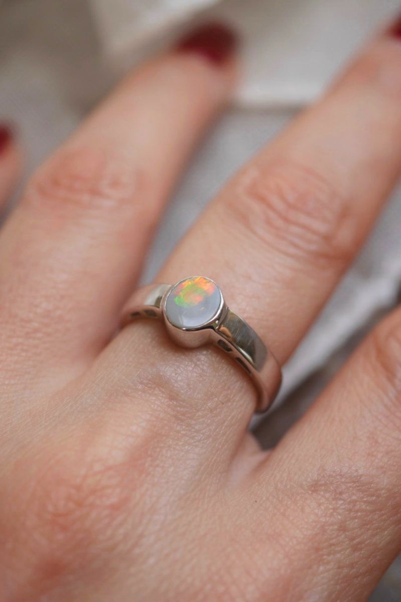 This sterling silver opal ring features a natural Australian opal cabochon set in a classic band, it's a modern piece with timeless appeal. Depending on how the light hits there are blue, green and red flashes visible.